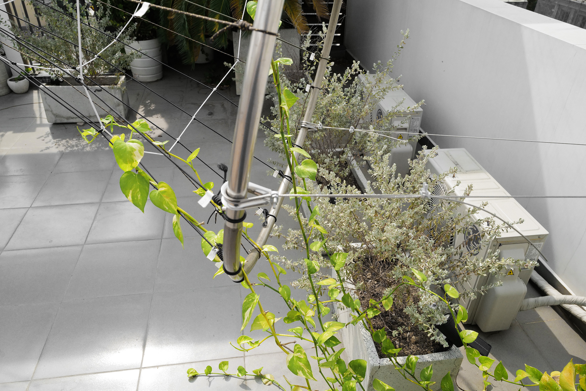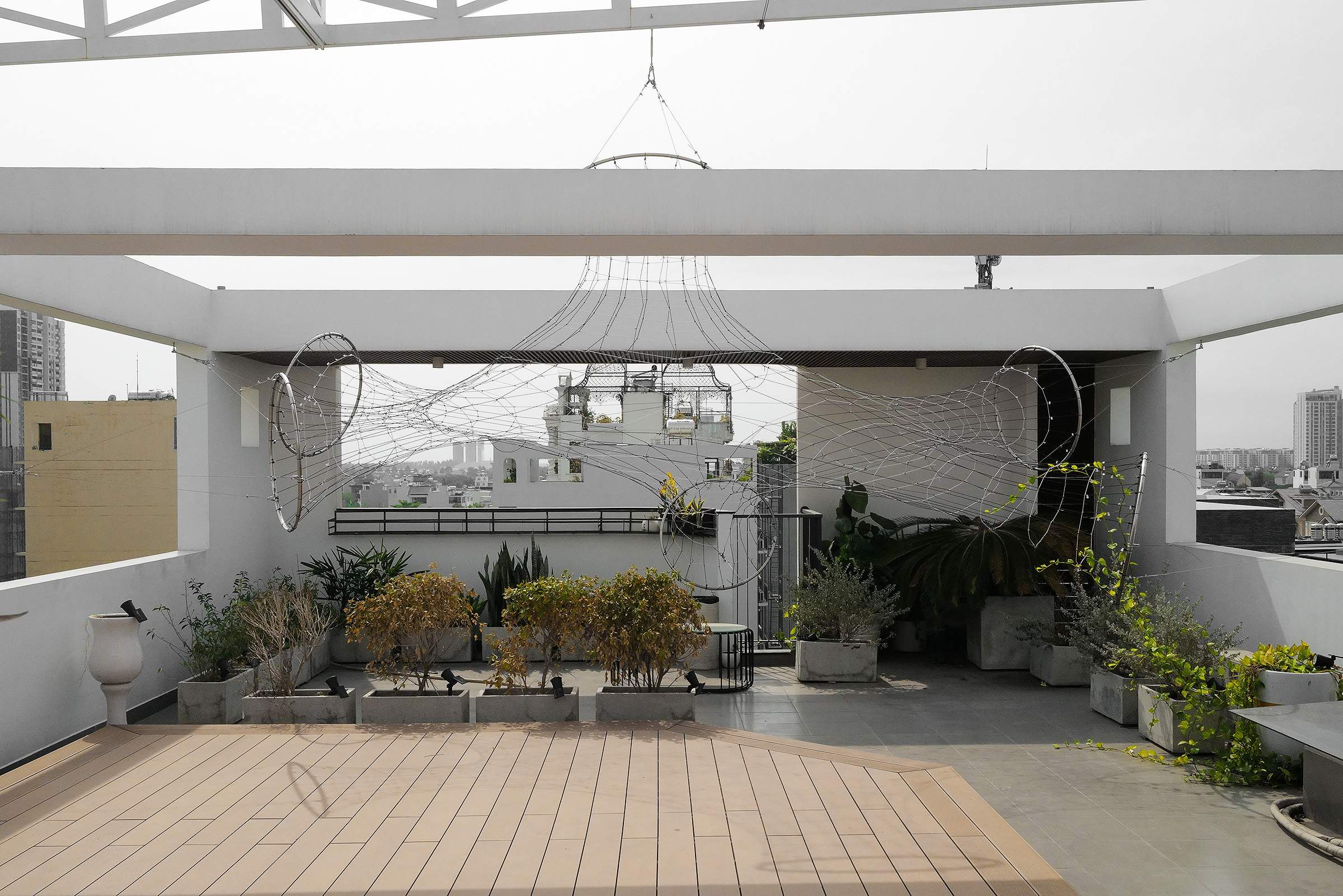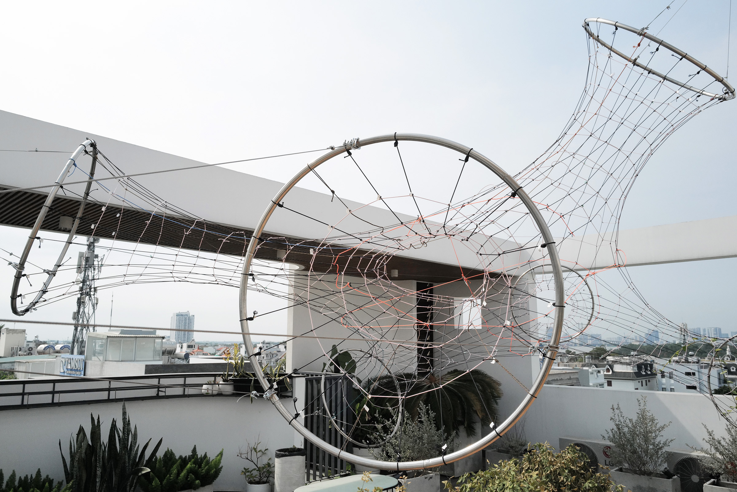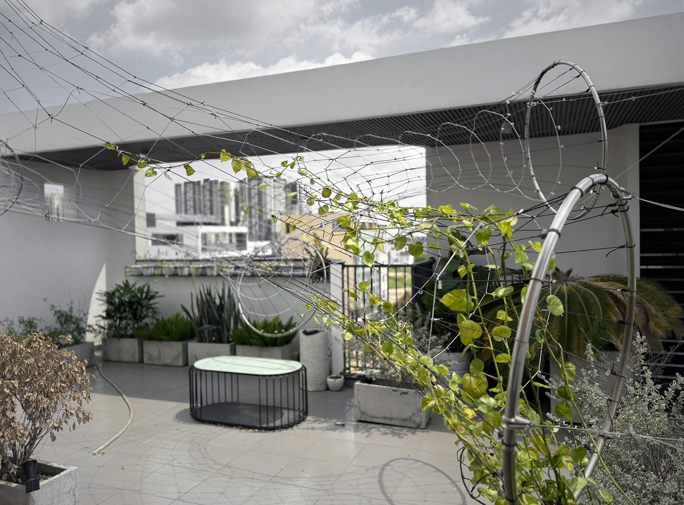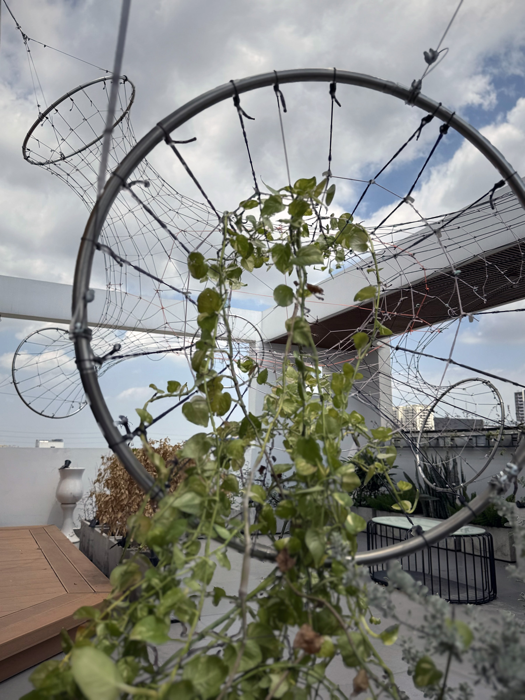 Green Mesh II is the second iteration of a climbing plant support system, building on a prototype first installed in Frankfurt (2020). Proposed for an office rooftop in Ho Chi Minh City, this version evolves from a single-layer mesh into a tubular configuration using six large rings to increase both spatial and structural complexity.